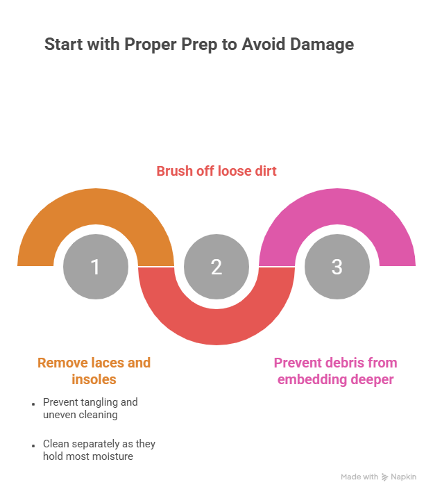 Before you even think about water, preparation is everything. Remove your laces and insoles to prevent tangling and uneven cleaning. These parts hold the most moisture and should always be cleaned separately.